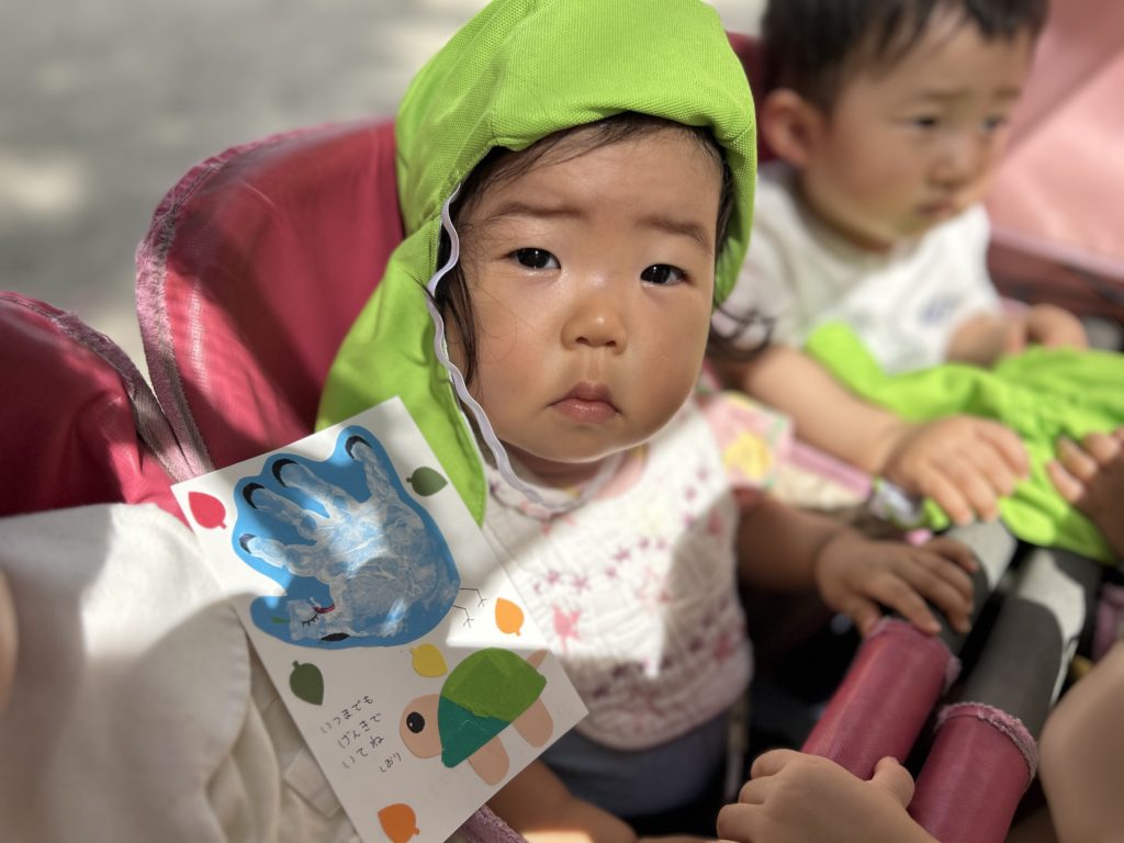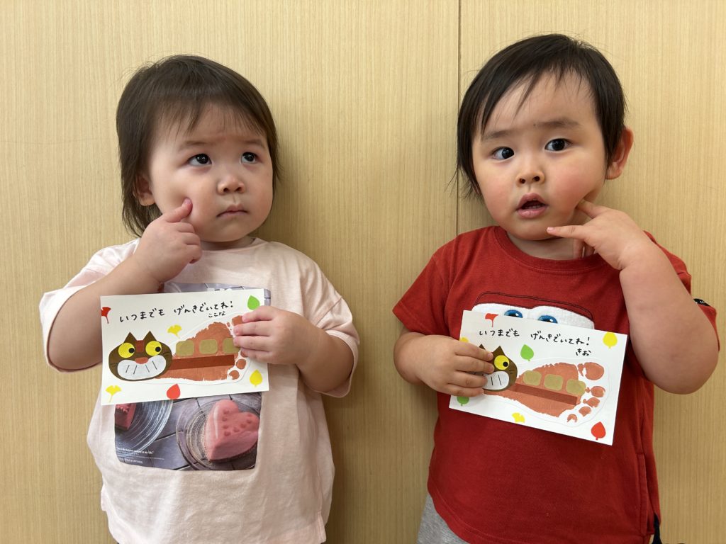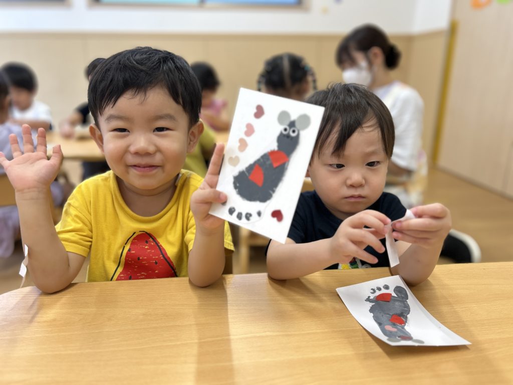 乳児組さんは手形・足型を取ってなにやら、かわいい形に!まだまだ小さい手足だからこそできる、素敵なハガキが完成しました🌈