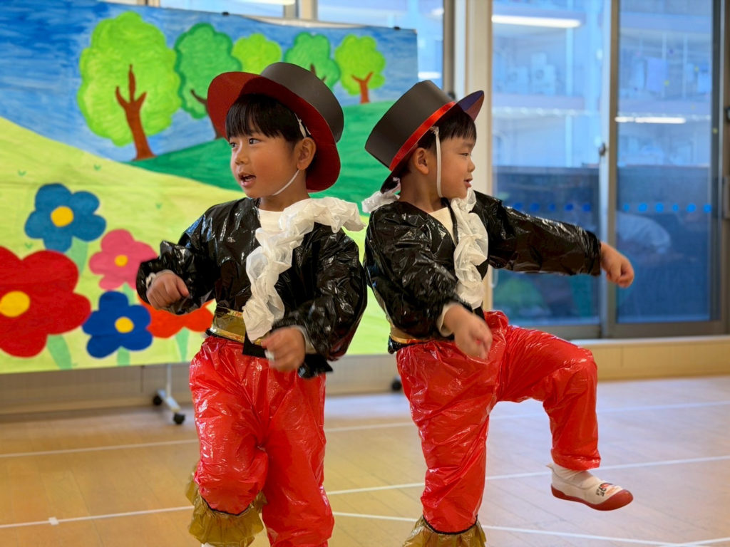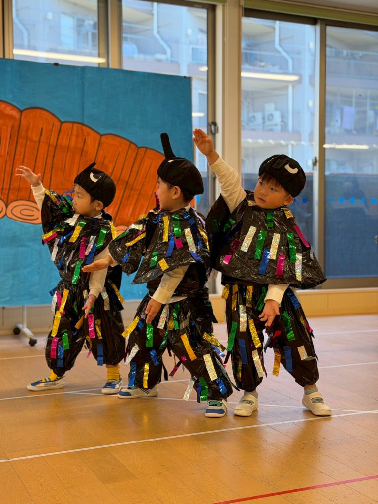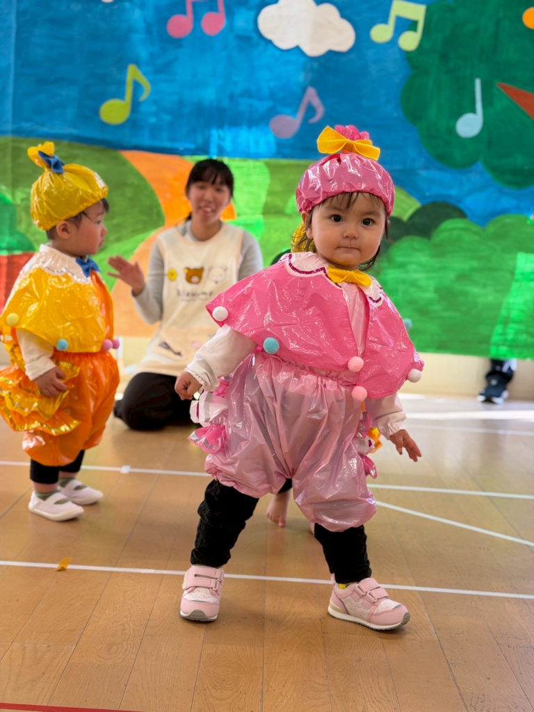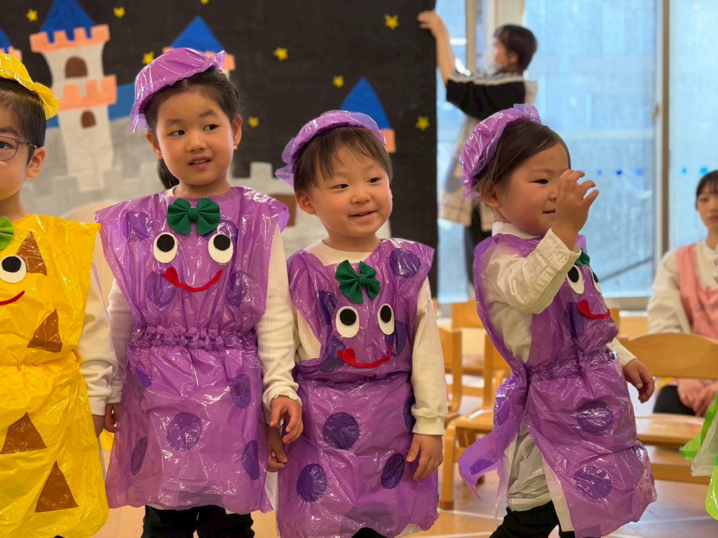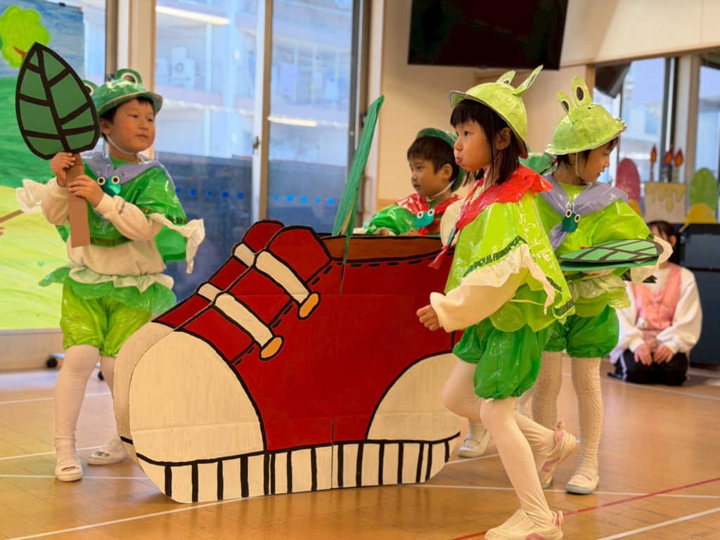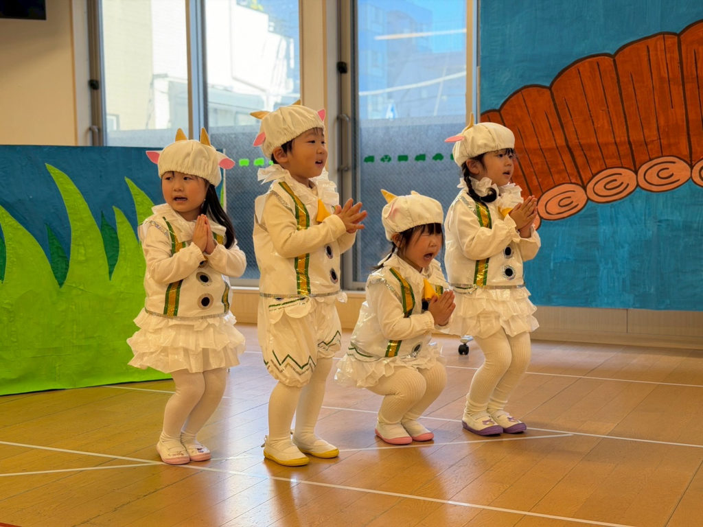 3歳、4歳児クラスはカエルのお話や、ヤギのお話などクラスの雰囲気にぴったりな題材をもとに、可愛い衣装を着て堂々と発表することができました🎶