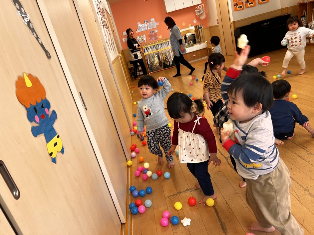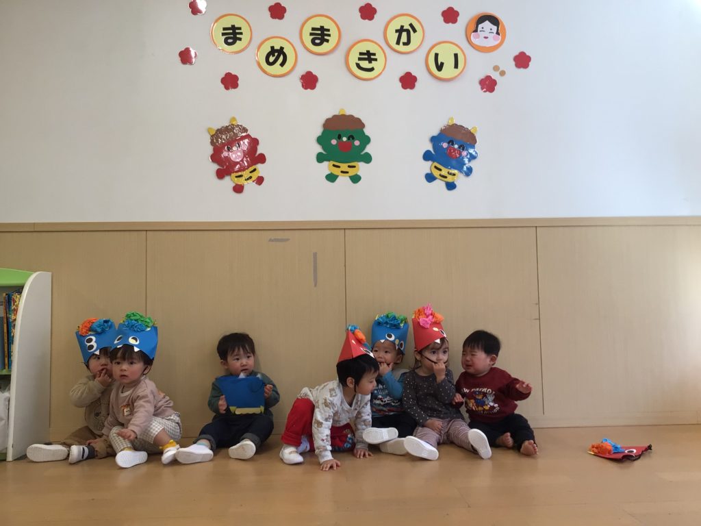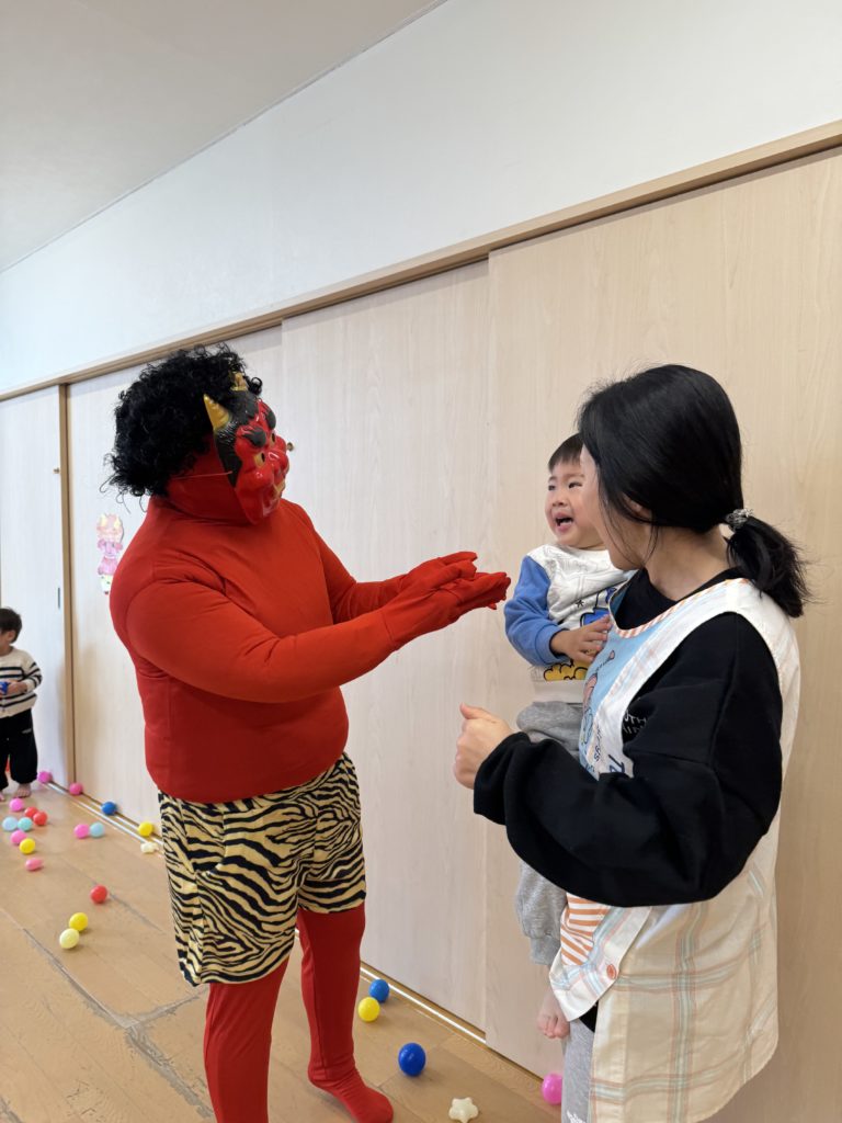 乳児組さん、豆まきを頑張りました!ちょっぴり涙も出ちゃったけど、優しい鬼がぎゅーってしてくれたよっ💓