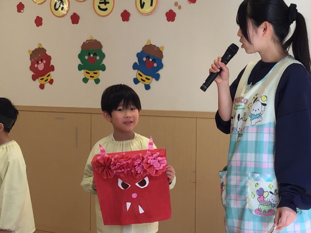 先日行われた豆まき会! 少し前から製作に取り組んだり、鬼のお話を聞いたりちょっぴりソワソワ…ドキドキ…