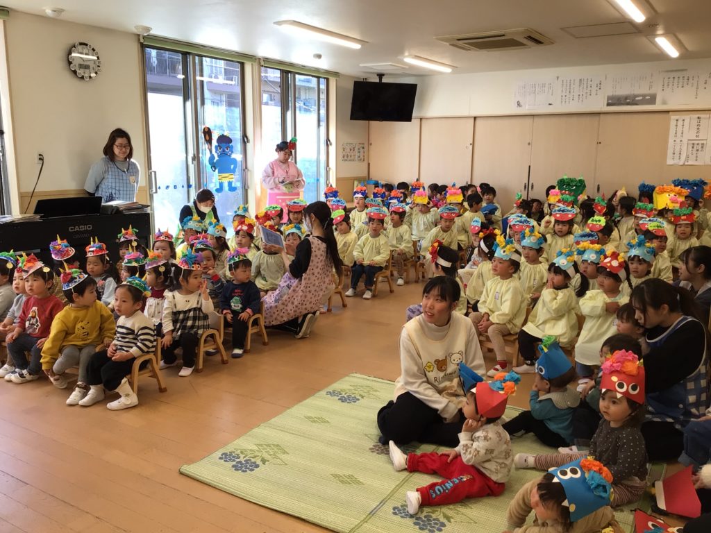 節分の成り立ちを聞いたり、一生懸命作った製作発表をしたり、歌をうたったり…みんで楽しく集会に参加しました🌈